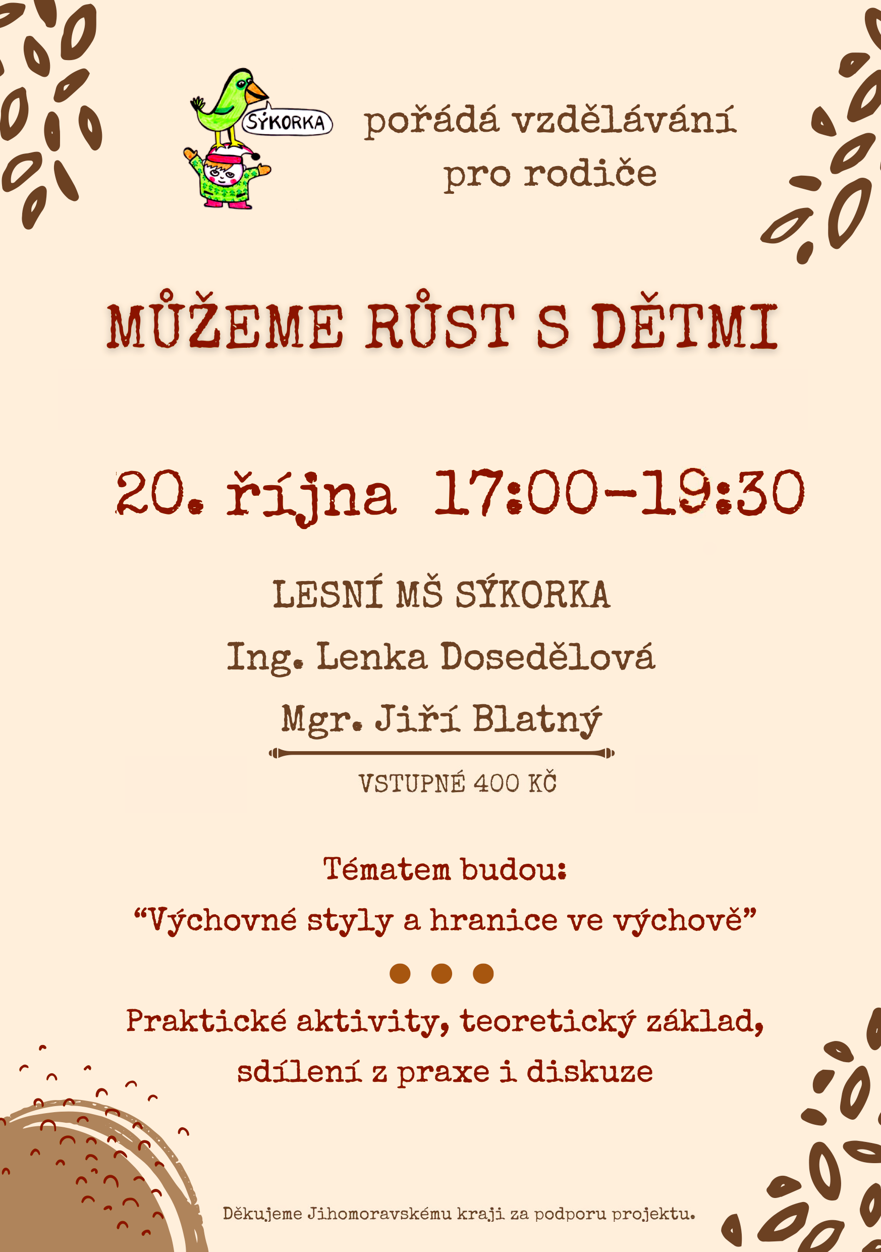 Rádi sdílíme pozvánku od Lesní mateřské školy Sýkorka, která pokračuje v inspirativním vzdělávacím cyklu pro rodiče s názvem „Můžeme růst s dětmi“.